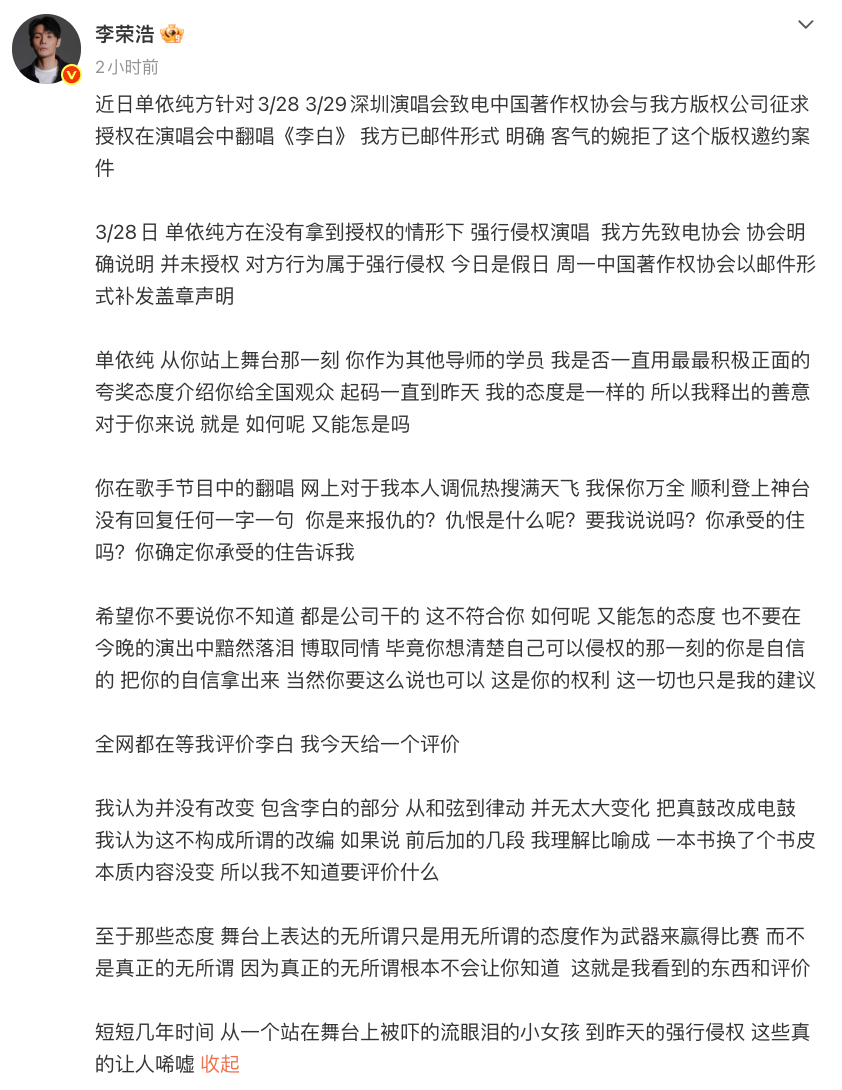 3月29日,知名歌手李荣浩在个人社交媒体平台上发布了一篇长文,公开指责另一位歌手单依纯在3月28日及次日于深圳举办的演唱会上,未经正式授权便翻唱了他的经典曲目《李白》,此举被明确界定为版权侵权行为。仅仅两小时后,单依纯也在社交平台上作出了简短回应,她表示:“我完全能理解李老师此刻的感受,首先,我要表达我的歉意。我会立即与团队沟通,尽快查明事情真相,并给大家一个明确的答复。”同时,她也强调了自己对版权意识的深刻认识,承诺会明确划清版权红线。 李荣浩与单依纯在微博上的发文引发了广泛关注。 据李荣浩的公开声明透露,单依纯方在演唱会筹备阶段确实曾通过中国著作权协会以及李荣浩的版权管理公司寻求授权,但李荣浩方已通过邮件方式“明确且礼貌地拒绝了这一版权请求”。然而,令人遗憾的是,单依纯方在明知未获得授权的情况下,仍然在3月28日的演出中擅自演唱了《李白》。这一系列行为表明,单依纯及其团队并非无意为之,而是存在主观上的恶意侵权,这对原创音乐生态造成了严重的损害。 李荣浩还在微博上晒出了中国音乐著作权协会的邮件截图,进一步证实了单伊纯方并未获得在演唱会中演唱《李白》的正式授权。 回顾去年,单依纯在《歌手》节目中对《李白》进行改编时,还仅仅引发了审美层面的争议。然而,此次在深圳演唱会上的行为,却彻底突破了艺术的界限,触及了法律版权的底线,性质截然不同。 版权是音乐行业的基石,尊重版权是行业健康发展的必要前提。版权方有权自主决定是否授权以及授权的具体条件,这是法律赋予的合法权利,任何形式的侵犯都是不可接受的。单依纯作为职业歌手,其团队理应熟知版权流程与法律边界,成为版权保护的积极践行者与示范者。然而,她却带头突破了法律与行业的底线,将他人的创作成果视为可以随意取用的资源,这不仅辜负了公众对艺人的职业期待,更向市场传递了一个极其错误的信号:版权规则可以被无视,原创权益可以被践踏。 从曾经“被吓哭的小女孩”到如今“强行侵权的歌手”,单依纯的这次“任性”行为,不仅让自己陷入了法律纠纷的漩涡,更给整个行业树立了一个极其负面的榜样。在流量至上的时代,版权意识绝不能被淡化。艺人的口碑,不仅仅取决于其唱功与舞台表现,更在于其职业操守与版权意识的高低。 对于单依纯而言,及时承认错误、诚恳道歉并采取切实有效的补救措施,才是挽回公众信任、重塑形象的正确途径。毕竟,艺术之路漫长且充满挑战,唯有尊重规则、敬畏创作,才能在这条道路上走得更远、更稳。 徽声在线记者 滕朝 编辑 吴龙珍 校对 张彦君 |