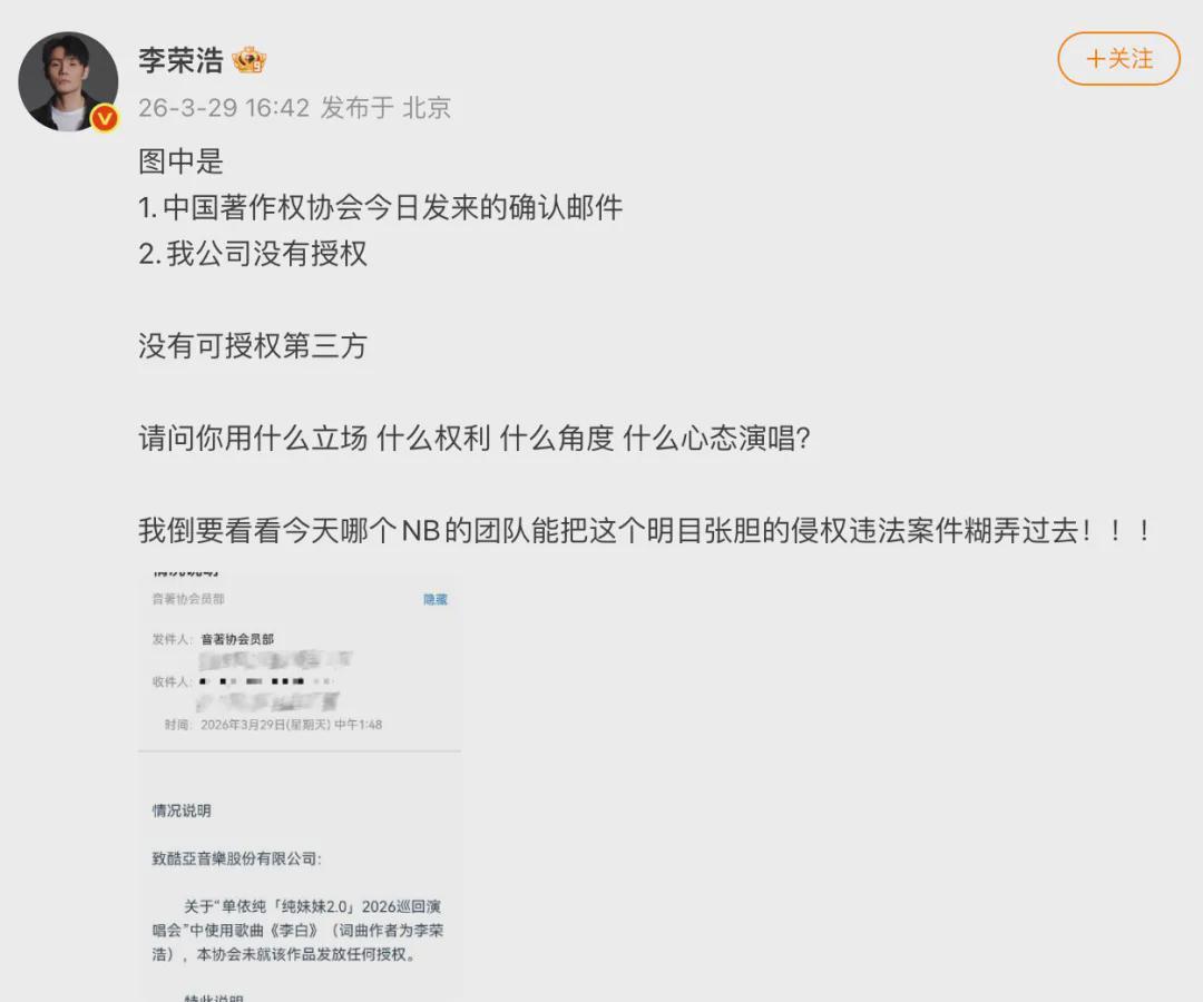 在今日(29日)这个备受瞩目的日子里,知名歌手李荣浩于社交媒体平台上公开发声,直接向新生代歌手单依纯喊话。他指出,单依纯在未获得其正式翻唱授权的情况下,擅自演唱了他的热门歌曲《李白》,此举涉嫌侵权。 面对李荣浩的公开质疑,单依纯迅速作出回应,她在社交媒体上发文致歉,并表示自己和团队正在积极了解事情的来龙去脉。“我们会尽快查明真相,给所有关心此事的人一个明确的答复。”单依纯诚恳地说,“我深知版权对于创作者的重要性,作为同样热爱音乐、致力于创作的人,我绝对会尊重并严守版权这条不可逾越的红线。” 然而,李荣浩并未就此罢休。他随后再次发文,明确表示中国著作权协会并未就《李白》一曲向任何方发放过翻唱授权。紧接着,李荣浩连发四问,直指单依纯:“请问你究竟是以何种立场、何种权利、何种角度、何种心态来演唱这首歌曲的?” 据徽声在线报道 |