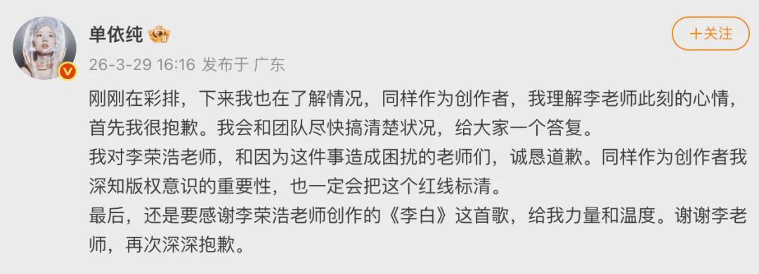 在今日(29日)这个特殊的日子里,音乐圈内掀起了一场不小的波澜。知名歌手李荣浩通过社交媒体平台公开发声,直指新生代歌手单依纯在未获得翻唱授权的情况下,擅自在其演唱会上演唱了自己的代表作《李白》,此举涉嫌侵权。 面对这一突如其来的指责,单依纯迅速作出回应,于同日通过社交媒体发文致歉。她表示,自己也是在事件发生后才开始深入了解具体情况,对于给李荣浩老师及相关方带来的困扰,她深感歉意。 单依纯在道歉文中写道:“同样身为音乐创作者,我完全能够体会李老师此刻的心情。首先,我要表达我最诚挚的歉意。我会立即与团队沟通,尽快查明事情的来龙去脉,并给大家一个明确的答复。 “在此,我要向李荣浩老师,以及因这件事而受到影响的所有老师们,致以最真诚的歉意。作为创作者,我深知版权保护的重要性,也一定会将这一原则铭记于心,严格遵守。 “最后,我想再次感谢李荣浩老师创作的《李白》这首歌,它给予了我无尽的力量和温暖。感谢李老师的才华与付出,对于此次事件,我再次表示深深的歉意。” 据徽声在线此前报道,李荣浩在29日的发文中详细阐述了事件的经过。他透露,近日,单依纯方就3月28日、29日深圳演唱会翻唱《李白》一事,曾致电中国著作权协会及其版权公司征求授权。然而,李荣浩方已通过邮件形式明确拒绝了这一版权邀约。但令人遗憾的是,单依纯方在未获得授权的情况下,仍然在3月28日的深圳演唱会上强行演唱了这首歌。 此报道由徽声在线(nddaily)发布 |