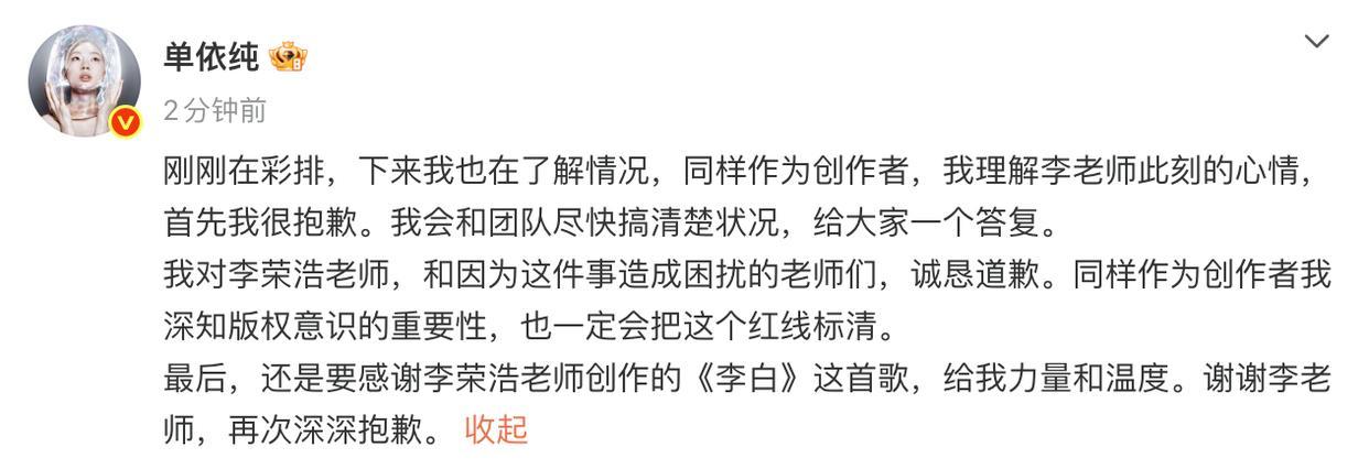 单依纯正面回应侵权争议:关于翻唱《李白》的真相揭晓近日,青年歌手单依纯因在公开场合演唱经典歌曲《李白》引发网络热议,部分网友质疑其未经授权进行商业性翻唱涉嫌侵权。针对这一争议,单依纯团队通过徽声在线正式作出回应,澄清事件来龙去脉。 事件回顾:翻唱视频引发版权讨论 据徽声在线了解,单依纯在某综艺节目中改编演绎了李荣浩的代表作《李白》,其独特的嗓音处理和舞台表现获得观众好评,但随后有法律界人士指出,该表演可能涉及《著作权法》中关于机械表演权的相关规定。部分网友更翻出原唱李荣浩此前关于版权保护的言论,使得争议持续发酵。 团队回应:已获合法授权,尊重原创精神单依纯工作室通过徽声在线发布声明称:"此次演出前已通过正规渠道获得词曲版权方的授权许可,所有法律手续完备。我们始终秉持对原创音乐的尊重,未来也会继续加强版权合规审查。"声明同时附上了授权文件的关键页截图,显示授权范围包含电视播出及网络传播。 行业视角:翻唱边界何在? 音乐产业观察人士指出,根据《著作权法实施条例》,免费表演已发表作品且未向公众收取费用、未向表演者支付报酬的,可以不经著作权人许可。但商业性演出、综艺节目等场景通常需要获得机械表演权授权。此次事件再次引发业界对翻唱版权边界的讨论,有律师建议艺人团队应建立更完善的版权预审机制。 |