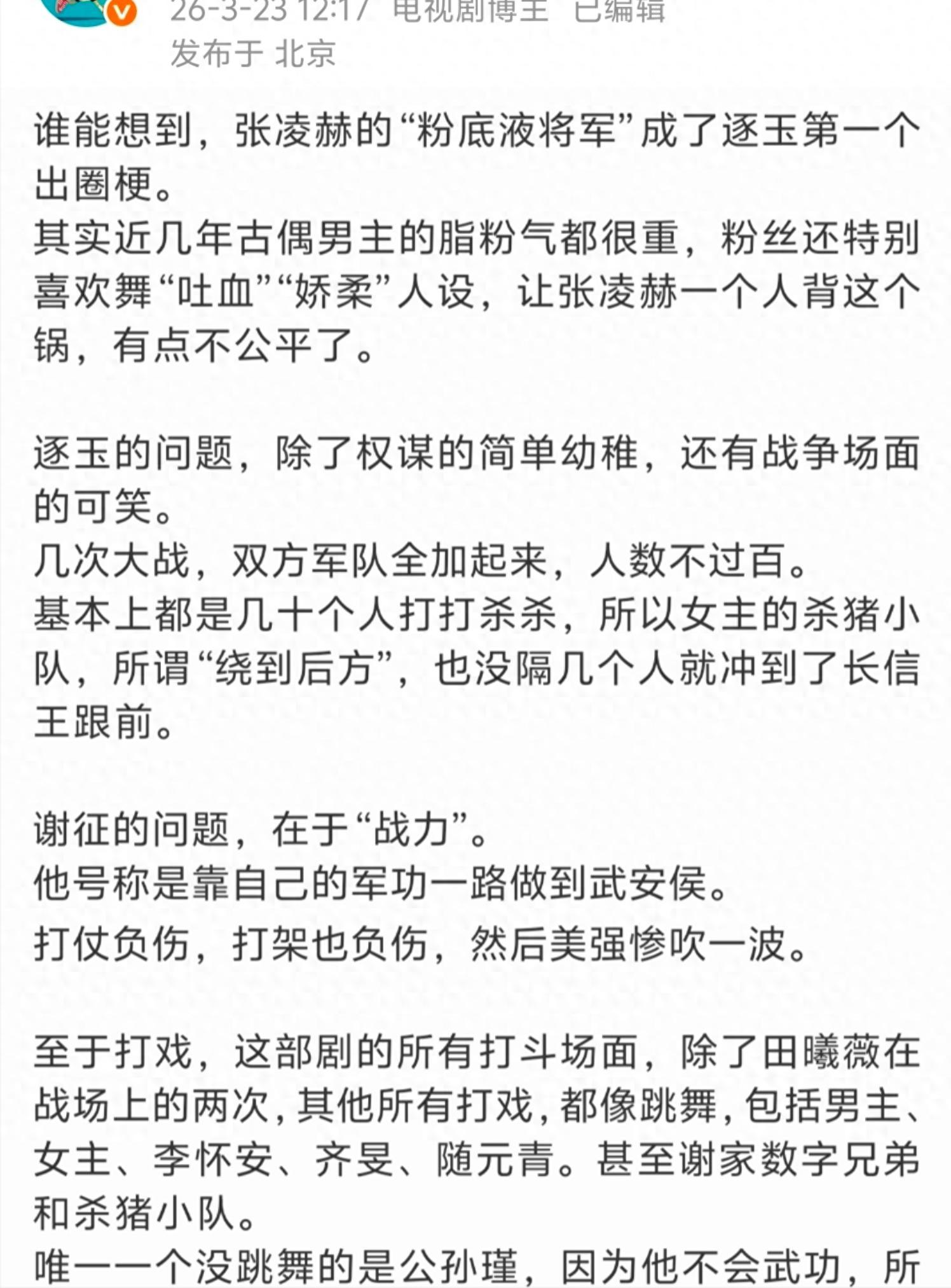 近期,古装偶像剧《逐玉》意外凭借一个极具争议性的梗成功出圈,在网络上引发了广泛的关注与热议。 这个梗便是被网友戏称为“粉底液将军”的现象。 在《逐玉》中,演员张凌赫饰演的谢征一角,设定为大胤王朝威名远扬的武安侯。他年少封侯,在沙场上叱咤风云,是令人敬畏的少年英豪,手下还统领着一支精锐的亲兵部队,堪称铁血战神。 张凌赫身高达1米9,外貌俊美,从外形条件上看,与小说里描绘的男主谢征颇为契合。导演在拍摄过程中,也精心捕捉了张凌赫不少展现其美貌的镜头。当他化身言正初次登场时,看向长玉的眼神仿佛带着钩子,那种楚楚可怜的模样,着实让人心生怜惜。 然而,这份美貌所带来的吸引力并未持续太久。当男主武安侯谢征头戴雉鸡翎紫金冠的造型亮相时,瞬间引发了网友们的强烈吐槽。这个造型过度追求美感,完全脱离了人物设定应有的底色,也正因如此,谢征被网友们冠上了“粉底液将军”的称号。 在大众的认知里,将军本应是披甲上阵、历经战火洗礼的形象。但剧中的谢征,脸上精心描眉画唇,看不到一丝刀口舔血、风吹日晒留下的风霜痕迹,全身更是干净得连一丝尘埃都不沾染。上战场时,他不戴头盔,反而扎着长长的马尾,显得十分不合时宜。 而且,即便经历了激烈的战场厮杀,他的脸部依旧白皙无瑕,这种脱离实际情境的表现,让观众感觉十分悬浮。 再看剧中铁血战神骑马的姿态,竟然摇头晃脑,毫无将军应有的沉稳与威严。与其说他是威风凛凛的将军,不如说更像是满城红袖招中那些游手好闲的纨绔子弟。 这样的形象直接颠覆了大众对于将军孔武有力的传统想象。毕竟在大家心中,真正的将军应该是像那些不用替身、不骑假马,在大全景冲锋时,无论武力还是气场都能轻松碾压敌军的存在。 例如在一些经典的影视作品中,将军们冲锋陷阵,尽显英雄气概,给观众留下了深刻的印象。 随着“粉底液将军”这一现象的出现,网上各种吐槽玩梗层出不穷,还掀起了一波将军形象对比的热潮。 饰演项羽的何润东因此再度受到关注,粉丝数量大幅增长,实现了翻红。而古偶剧《一笑随歌》也凭借相关话题热度,飙升至今年剧集榜的第一名。 其实,观众反感的并非是帅气的将军形象。关键在于演员要能够展现出将军应有的气质和精湛的演技。 就像张智尧饰演的杨宗保,他拥有一张帅气无比的脸庞,但在近身搏斗还是使用长枪短刀时,都表现得十分出色,又英气又飒气,曾经迷倒了无数观众。 孙晨曦饰演的俏罗成,同样是一位面若好女的美男子。然而在打戏方面,他从不敷衍,其雄姿英发的帅气形象给观众留下了深刻的印象。 再说吴磊饰演的阿诗勒隼,在戏内他不借助威亚就能轻松上马,无论是单手骑马狂奔还是打戏,都表现得干净利落、行云流水,尽显飒爽英姿。 对于饰演将军的演员来说,穿盔甲拿兵器拍打戏是必须具备的基本能力,这是塑造真实可信将军形象的重要环节。 反观张凌赫在《逐玉》中的表现,他似乎并没有遇到什么像样的敌人,身负重任却一心只想着谈恋爱,对其他事情都漠不关心。 在一场战斗结束后,身为军之将的他,不想着关心士兵的安危,也不去收拾战场,反而只关心女主,匆匆跑去和女主谈恋爱。 从花絮中可以看出,张凌赫在演绎英气将军时,完全看不到任何武训的痕迹。他上马都显得十分费劲,还需要借助威亚的力量。 下马时,他自己都无法顺利下来,还需要别人递上板凳辅助。 在挥舞长枪时,仅仅两下就累得气喘吁吁。 走路时的仪态更是糟糕透顶,毫无将军应有的气势和沉稳,仿佛只有走秀出片的决心。 如此糟糕的表现,别说展现精湛的演技了,就连角色的基本形象都难以立得住。 难怪网友们会吐槽:“六点要打仗,四点就得起床化妆做造型。” “粉底液将军”的外号也就自然而然地流传开来。 这一现象甚至惊动了官方账号“钧正平”,该账号罕见地跨界对“粉底液将军”进行了锐评。徽声在线指出,古装剧里这种涂脂抹粉的“将军”形象,无法承载起塑造阳刚之气的社会责任。 文章强调,文艺创作虽然可以追求审美多元,但不能对军人形象进行过度“美颜”,从而削弱了尚武报国的精神内涵。 其实,“钧正平”的点评已经十分体面了,既没有点明具体是哪部剧,也没有提及是哪个明星。 如果粉丝和正主能够保持沉默,这件事或许就会慢慢过去。然而,张凌赫的粉丝却跑到官号下面闹事,引发了更多的争议。 “粉底液将军”之所以会被官媒痛批,归根结底是演员无法演绎出将军出入沙场应有的血性刚毅,也无法展现出少年将军的风发意气,更无法呈现出战无不胜的肃杀之气,完全没有一丝为将者的威仪。 剧组过于注重演员油头粉面的形象,描眉画唇或许在古偶剧中尚可理解,但发型精致、头戴雉鸡翎还摇头晃脑,身不染尘的样子与身上的铠甲极不协调。演员随时随地都在耍帅,无时无刻不背负着偶像包袱,根本不像是一个将军,反而更像一个养尊处优、玩世不恭的少爷去战场走秀,这样的形象实在难以让观众信服。 在当今这个时代,大家面临着巨大的压力,信息也呈爆炸式增长。追剧对于很多人来说,只是为了图个乐呵,这本身并无问题。但是,无论在什么时代,我们都应该追求卓越和严谨,用心做好每一件事,这样行业和社会才能不断进步。 古偶剧可以追求帅和美,但不能仅仅只有外在的皮囊,而缺乏内在的筋骨。所以,即便