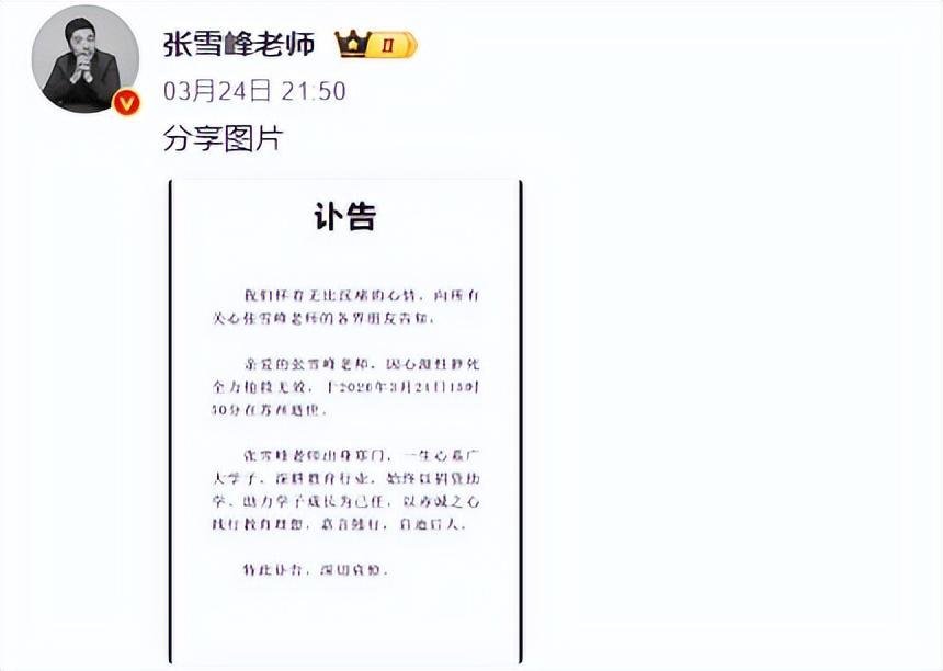 3月24日,教育领域知名博主张雪峰因心源性猝死,在苏州经全力抢救无效后离世,年仅41岁,这一消息如惊雷般震惊了全网,无数人为之悲痛不已。 张雪峰的突然离世,让整个网络世界都沉浸在一片哀伤之中。 其公司发布的讣告中有一句话令人动容,“始终以捐资助学、助力学子成长为己任,以赤诚之心践行教育理想”,这无疑是对他一生教育事业的最好诠释。 在很多人心中,张雪峰是一位坦率诚恳的教育者。他凭借自己的努力和智慧,改变了众多迷茫且缺乏背景家庭的孩子的命运,同时也推动了中国高校教育产业进行自我审视与改革,为中国教育的发展做出了不可磨灭的贡献。 对于他的骤然离世,大家主要惋惜两点。 其一,41岁本应是人生中最具活力和创造力的年纪,正值壮年,却突然离世,实在令人痛心疾首; 其二,他生前敢于打破教育领域的某些“信息壁垒”,敢于直言不讳地说出真相,像他这样真诚且勇敢的人,以后又少了一位,这无疑是教育界的一大损失。 随着他的离世,一些熟悉他的人纷纷在网上表达悼念之情。 篮球点评员杨毅评价他“嬉笑怒骂,为民献策,人世间大闹一场”,还直言张雪峰是他一直想见却未曾谋面的人。 资深媒体人胡锡进也为之唏嘘不已,感到十分难过。在他看来,张雪峰老师是互联网多元性和张力的标志之一,拥有一个有趣且独特的灵魂,只可惜人生无常。 歌手刘维发文感谢张雪峰在综艺《火星情报局》中对他的照顾,字里行间充满了感激之情。 还有那个为上清华复读13年,曾与张雪峰直播连线并被后者建议不要复读的唐尚珺,在动态中写道,“虽与张老师在网上仅有一面之缘。我们确实互知彼此。斯人已去,不论功与过。”表达了对张雪峰的缅怀之情。 最悲伤的莫过于张雪峰的好友兼合伙人徐涛。他的话简短却戳心,仅有12个字——“难以置信,缓不过来,很难接受”,足以看出他对好友离世的悲痛与不舍。 是啊,明明上午还有联系的人,仅仅隔了几小时,就阴阳两隔,这种巨大的落差让人难以承受。 而在他的评论区,一条“还记得你们雨夜的合照”的留言,更是让人不禁潸然泪下。 那么,张雪峰为何会如此突然离世呢?回看他离世前的细节,或许一些征兆早已隐藏其中。 一、被全网追问的去世当天,与张雪峰的生死观 关于张雪峰离世的消息,最早是在24日当天傍晚左右开始流传的。当时,有一位网友在网上发帖称,张雪峰因心脏骤停,被紧急送往了附近的独墅湖医院。而且,人在送过去时,瞳孔已经扩散,这表明当时张雪峰老师的情况已经非常危急了。 不久后,网上还传出了疑似其被送往医院的照片。画面中的一名男子,穿着短裤、运动鞋,被推往医院。而这双鞋,确实曾在张雪峰跑马拉松时出现过,这进一步增加了消息的可信度。 就在大家担心张雪峰的状况时,又有人爆料,“在我朋友医院抢救,人已经走了”,这一消息让网友们的心再次揪紧。 很快,有记者联系到张雪峰的助理万霞。但她回复称,自己目前人在成都,对于网上流传的关于张雪峰的信息并不太清楚,而张雪峰的合伙人与朋友也都表示“无可奉告”,这让事情更加扑朔迷离。 事情的发展让网友们感到十分不安。毕竟,如果是谣言,本人或者亲友只要发一条动态,就能轻松澄清。到了24日当晚,网上关于“张雪峰去世”的消息越来越多,被扒出的“证据”也越来越清晰。 先是原定在当日18点的直播被取消,紧接着,他旗下的直播间被大量网友涌入,大家都在询问张雪峰的状况,而主播们却都三缄其口,概不回应。之后,这些直播间就出现了异常,主播们集体下播。与此同时,张雪峰全平台的个人账号几乎在同一时间,头像都变成了黑白色,这一系列举动无疑让网友们更加确信他离世的消息。 没多久,张雪峰去世的确切消息被曝出,全网陷入一片悲痛之中。 其实,在网上消息满天飞的时候,也有人在分析,张雪峰的身体或许早就“不堪重负”。要知道,他的身份不仅仅是一名博主,名下还关联了11家企业,是九家公司的法人。除了公司的事务,他还是一个知名IP,光是每年的高考季与考研季,这两个高强度的工作时间段,就让他疲惫不堪。 这种累,他自然心里明白。他也想休息,但现实却不允许他这么做。八年前,他在自己的社交账号写了这么一段话,如果有一天,让他选择一种死法,他希望自己是猝死,且是在不久的将来。这或许是他当时对生活压力的一种无奈宣泄。 六年前,他去了一趟太原,在那里他和一个老哥交谈时,得知这个老哥在办公室与人交谈的时候,血压上升人差点没了。张雪峰说,如果自己遇到这样的事,千万别把他救醒,因为这样,他便可以休息了。从这些话语中,我们可以看出他对休息的渴望以及对生活压力的无奈。 对于生死,他或许早已看透。而他最大的心愿,便是想成为学生与家长们一代人的回忆,为中国教育事业贡献自己的力量。 坦白说,他的身体状况在2023年就因为类似的病情而住院治疗过。而据网友们猜测,他的猝死,一部分是因为长期的高强度工作,比如熬夜,另一部分则可能是因为高强度的运动。 在他去世前的当天,中午仍坚持边吃饭边直播。从直播的画面中能看出,他的饮食比较油腻,这可能对他的身体造成了一定的负担。此外,他是在中午跑步时,突发病情,这或许与他之前的高强度工作以及不健康的饮食习惯有关。 也有网友解释,张雪峰之前完全有机会挽回自己的生命。在早前直播