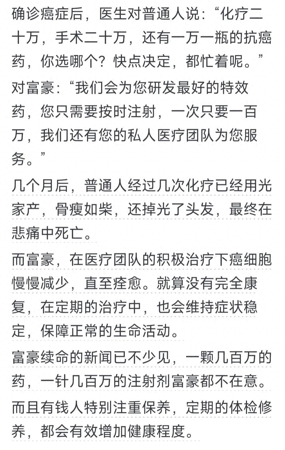 今日热议:为何诸多超级富豪罹患癌症后却能成功治愈?接下来,徽声在线小编将引领大家一同探讨,网友们对此有何独到见解。 有人认为,财富虽能让人更早地发现癌症,但在治疗成效上,差异或许并不如想象中那般巨大。毕竟,许多常见肿瘤的治愈率本就相对较高,这并非完全归功于富豪们的雄厚财力。 提及乔布斯,他以其非凡的感性创造力著称,否则也难以缔造出苹果这样的科技巨头。他深信神秘学,对东西方的各种玄学几乎都有涉猎。倘若他生长在中国,或许会成为中药与针灸的忠实拥趸。 李开复面对癌症时选择了积极治疗,而乔布斯则因未给予足够重视而错失了最佳治疗时机。当然,癌症的治愈与否还与其所在位置、病理分型、分期以及分化程度等诸多因素息息相关。 有网友分享了自己的亲身经历:父亲从发现肝癌中期到离世,仅短短一年半时间。这一年半里,全家四处筹措资金,争吵不断。父亲去世后,还留下了债务,哥哥因此离婚,整日借酒消愁。母亲则独自承担起抚养侄女的重任。这场病痛,让原本和睦的家庭支离破碎,成员间的关系也变得疏远,很少再联系。这场病,无疑将家庭中每个人的自私面都暴露无遗,最终导致了家破人亡的悲剧。 另一位网友则讲述了母亲的故事:去年11月,母亲被查出膀胱癌。在检查前,他就已预感到结果,但并未告知母亲。母亲曾躺在病床上说,如果自己得了癌症就不治疗了。然而,当病检结果出来后,她沉默了。家人还是决定为她进行积极治疗,尽管治疗过程痛苦不堪,不仅母亲受罪,儿女们也疲惫不堪。但真正查出癌症后,又有几个人会选择放弃治疗呢? 看完网友们的这些真挚分享,屏幕前的你是否也有许多感慨想要倾诉?欢迎在评论区留言,与大家一同分享你的看法与感受。 |