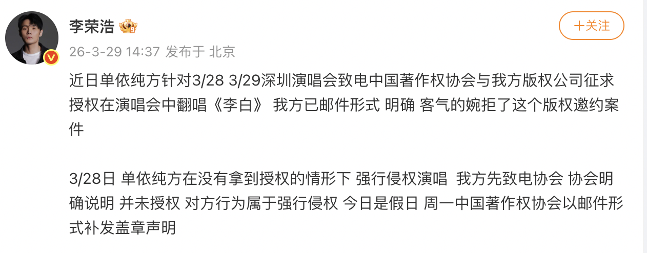 近日,歌手单依纯与李荣浩之间因歌曲《李白》的版权问题引发了一场风波,这一事件不仅引起了音乐行业内部的广泛关注,也让公众对版权保护的重要性有了更深刻的认识。 据徽声在线了解,事件的起因是3月29日下午,李荣浩在社交媒体上连续发布多条动态,公开指责单依纯在深圳的一场商业演唱会上,未经其授权便翻唱了其代表作《李白》,这一行为涉嫌构成版权侵权。此消息一出,立即在社交平台上引发了热烈讨论。