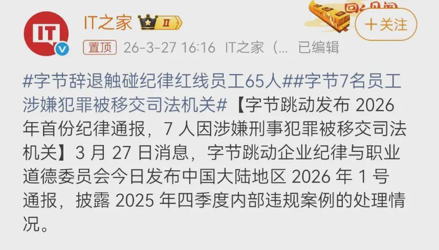 近日,互联网行业被一则重磅消息所震动:“字节跳动多名员工被处理!” 消息传得沸沸扬扬,气氛异常紧张。我迅速查阅了官方渠道的信息,发现事情远比传言复杂,但同样不容小觑。 据最新消息,字节跳动(抖音的母公司)近期发布了内部纪律处分通报,一次性辞退了65名员工,其中7人因涉嫌严重刑事犯罪,已被直接移交司法机关处理。 这意味着什么?不仅意味着这些员工将被开除,还可能面临法律的严惩,同时他们的职业生涯也将被打上难以抹去的污点,在行业内几乎难以立足。 这并非个例,也非首次发生。回顾去年全年,字节跳动共辞退了353人,移送司法机关处理的达39人。这些数字背后,反映出这家互联网巨头对内部管理的日益严格和决心。 许多人或许只是抱着看热闹的心态,认为这只是“内鬼”的倒霉事。然而,事情远非如此简单。 这背后,折射出的是中国互联网巨头们正集体步入一个“强治理、零容忍”的新时代。 01 他们究竟犯了什么错? 通报中列举的违规行为,看似微不足道,实则危害巨大。 首当其冲的是:账号出借,秘密泄露。 有9名员工因将自己的“飞书”(字节内部办公软件)账号或办公电脑借给他人使用,而被直接开除。这听起来似乎有些“小题大做”,但实则不然。 飞书账号,是进入字节跳动这座庞大“数据帝国”的钥匙。一旦借出,就意味着公司的组织架构、业务数据、核心决策,甚至同事间的聊天记录,都可能被外人窥探。 在商业竞争中,这无异于将布防图拱手送给敌人。对于一家依赖信息和算法生存的公司来说,这无异于背叛。 其次,是离职后“靠山吃山”,利用信息差牟利。 有前员工在脉脉、小红书等平台上,公然贩卖公司内部信息,甚至提供付费“面试辅导”服务。这相当于什么?就像是从一家印钞厂离职后,偷偷将印钞机的图纸和安保排班表卖给想抢银行的人。 这些前员工或许以为“我都走了,你能拿我怎样?”但字节跳动用实际行动告诉他们:无论何时何地,都将追责到底,直至赔钱道歉。 最后,也是最为严重的:涉嫌刑事犯罪。 虽然通报中未明确具体罪名,但结合过往案例,无非是受贿、职务侵占、与外部勾结进行利益输送等。 比如,负责广告投放的员工私下收钱为特定渠道增加投放量;负责采购的员工在供应商处拿回扣;负责审核的员工收钱为人“开绿灯”…… 这些“内鬼”所吞噬的、所拿走的、所破坏的,是公司最核心的资产:公信力、数据和资金。他们给公司带来的,是真金白银的损失和难以估量的风险。 02 为何选择此时出手? 字节跳动,以及阿里、腾讯、美团等互联网巨头,为何近年来突然对自己人“下手”如此狠辣? 答案其实很简单,因为时代已经变了。 1. 体量庞大,经不起“蚁穴”之患。 抖音、今日头条等应用,已成为国民级产品,每天有数亿用户在使用。它们已不再仅仅是简单的App,而是成为了庞大的社会基础设施。 这样的体量下,任何一点内部腐败或数据泄露,都可能被无限放大,引发公关危机和监管风险。 以前,公司规模小,容易调整方向;现在,它已成为一艘航母,一个小漏洞就可能让整艘船沉没。因此,必须采取严厉措施,以防患于未然。 2. 行业进入“拼内功”的下半场。 互联网的黄金十年已经过去,跑马圈地、烧钱扩张的时代已经结束。 现在,大家比拼的是什么?是精细化运营、组织效率和成本控制。以前为了抢占市场,可以默许一些灰色手段的存在。 但现在,每一分钱都要花在刀刃上,每一个流程都要透明高效。那些趴在流程上吸血、增加内耗的“蛀虫”,自然成为了必须清除的对象。 3. 向资本市场展示“自我管理能力”。 一家公司的价值,不仅取决于其业务增长速度,更取决于其公司治理的健康程度和内控的严密性。 一个频繁出现“内鬼”、管理混乱的公司,就像一座外表华丽但内部钢筋被腐蚀的大楼,谁敢长期持有其股票? 因此,高调反腐、严格内控,也是向市场和投资人展示:我们很健康、很规范,值得信赖。 用一句通俗的话来说就是:以前是草莽英雄,抢地盘要紧,身上脏点没关系;现在是坐江山的皇帝,要讲规矩、立法律,不然龙椅坐不稳。 03 对我们普通人有何影响? 这场席卷互联网大厂的治理风暴,影响的绝不仅仅是那几个“倒霉”的员工,更是对所有人的一次警示。 对于大厂员工来说,以前“浑水摸鱼”的红利期已经结束。以前进大厂,意味着高薪、期权和光环;现在,还意味着无处不在的监控、严格的审计和不能触碰的“高压线”。 那份让你财富自由的期权,现在也成了悬在头顶的利剑——一旦违规,不仅被开除,期权还将直接归零。大厂这碗饭,越来越好吃,但也越来越难端稳。它要求你不仅是人才,还得是个干净的、守规矩的人才。 对于求职者来说,背景调查将成为“生死关”。互联网行业联盟的“黑名单”可不是闹着玩的。如果你因为贪腐、泄密等问题被一家大厂处理并录入名单,其他所有联网的大厂都会在背景调查时看到你的“案底”。 这意味着你可能被整个行业封杀,职业生涯的污点将“云存储”且永久有效。 此外,从整个商业环境来看,这也预示着一个更规范但也更紧绷的时代即将到来。 从积极的角度来看,这有助于净化商业环境,让资源更公平地配置,让守规矩的人得到更多机会。 阅读字节跳动的这份通报,我最大的感触不是“又抓了几个坏人”,而是一种强烈的秩序感正在被建立。 它用真金