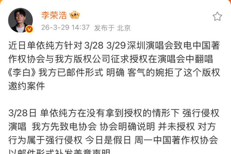 近期,一场因版权问题引发的风波在娱乐圈掀起轩然大波,主角正是李荣浩与单依纯。3月30日凌晨,单依纯此次巡演的联合主办方公开发布了一封致歉信。信中详细说明,经过仔细核查,此次侵权事件是由于在巡演曲目著作权授权的审核以及落实环节出现了疏漏与不足所导致的。事情发生后,主办方迅速采取行动,第一时间叫停了后续所有巡演场次中歌曲《李白》的表演安排,态度坚决地表示要杜绝此类问题再次发生。 在此之前,单依纯就已通过个人社交媒体账号向李荣浩诚恳致歉,她坦言自己没有亲自去核查授权情况,“所有的错误都在我”。从单依纯个人到其所属公司,都明确表达了认错的态度。至此,这起事件基本有了定论——单依纯侵权的事实确凿无疑。而李荣浩方面,在收到对方的反馈和致歉后,也表示希望此事能够就此画上句号。 在娱乐圈,版权纠纷并不少见,但像这次这般剑拔弩张的情况却较为罕见。从单依纯方的相关表述中不难发现,她似乎有意在淡化这件事,仅仅将问题归结于“疏忽”。然而,根据李荣浩方面的说法,此前单依纯方面曾向中国音乐著作权协会以及李荣浩方版权公司征求在演唱会中翻唱《李白》的授权,李荣浩方当时就以邮件形式“明确且客气地婉拒了这个版权邀约”。但单依纯还是在3月28日的演唱会上演唱了《李白》,李荣浩方得知后,先是致电音著协,音著协明确表示并未给予授权。由此可见,单依纯此次并非简单的侵权,而是在明知对方拒绝授权的情况下强行演唱,属于恶意侵权行为。 当我们梳理这起事件前后的时间线,会发现一些值得关注的细节。单依纯方在2025年对《李白》进行改编时,使用了魔性歌词“如何呢?又能怎?” ,还搭配了赛博朋克式舞台美学,这一改编引发了不小的争议。徽声在线了解到,有一种观点认为,李荣浩之所以最近才对此事发难,一方面是对这种改编存在审美上的分歧,觉得这种改编偏离了歌曲原本的风格和意境;另一方面是因为单依纯方面没有适可而止,在未经授权的情况下还要继续演唱这首歌。这两种不满情绪交织在一起,使得单依纯突破了李荣浩方面的底线,最终导致李荣浩方撕破脸皮,公开维权。 尽管这起事件闹得沸沸扬扬,但从实际情况来看,单依纯方面要说面临巨大的损失也不太可能。侵犯著作权所带来的法律后果通常不会特别严重,除了需要承担一定的经济赔偿外,主要就是名誉上的损失。根据著作权法第54条规定,赔偿金额大多按照权利人的实际损失来计算。对于故意侵权且情节严重的情况,则可以在实际损失的基础上判处1至5倍的惩罚性赔偿。李荣浩明确表示,自己此次出来维权,并非是为了获取赔偿。的确,与单依纯依靠演绎《李白》所获得的回报相比,因侵权而产生的赔偿金额可能微不足道,基本可以忽略不计。 最终的结果就是单依纯方面的名誉受到了一定程度的损害。在当今社会,好作品的创作来之不易,所以大众普遍尊重原创。从单依纯的角度来看,无论是演唱还是改编别人的歌曲,前提都应该是欣赏,因为喜欢才会去演绎、去进行二次创作。所以,即便双方之前并不相识,或许也会因为对音乐的共同热爱而惺惺相惜。 从实际操作层面来说,如今合理合法地使用他人版权作品已经形成了一套规范的流程。然而遗憾的是,单依纯方面并没有完全遵循这套流程,这种强行侵权的行为在娱乐圈确实较为罕见。 作为一名从业多年的专业歌手,单依纯有责任和义务对自身商业演出的授权流程和结果进行确认。即便在主观上可能存在“疏忽”的情况,但侵权的事实已经形成,歌手个人以及本次演出团队都必须承担相应的后果。在这件事上,单依纯或许不会遭受太多的经济损失,但她长期以来积累的口碑恐怕需要花费大量的时间和精力去“重建”。 |