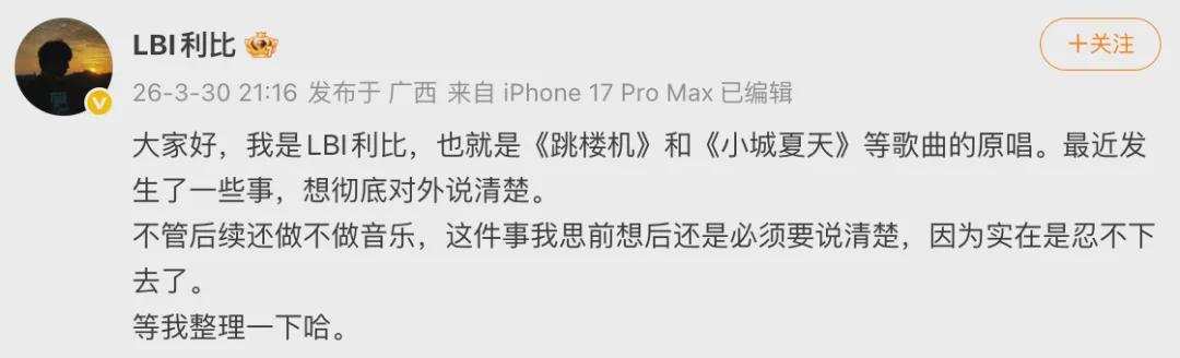 3月30日晚间,凭借《跳楼机》《小城夏天》等热门单曲在乐坛崭露头角的音乐人LBI利比(本名时柏尘)突然在社交平台发布动态,直言"近期遭遇的系列事件已突破底线,必须向公众说明真相",引发粉丝与行业关注。 次日零时许,这位94年出生的创作型歌手发布千字长文,实名举报环球音乐中国区在EP合作及巡演过程中存在版权侵占、违规签约、资金拖欠等六大违规行为,相关话题迅速登上微博热搜榜第12位。 根据利比披露的细节,这场纠纷可追溯至2025年6月的合作协议: 版权争夺战:利比团队透露,该EP项目累计投入制作费超80万元,除《冷空气》外其余5首作品的词曲版权均归属创作方。但环球音乐在未取得书面授权的情况下,不仅将作品上架至20余个数字音乐平台,更宣称拥有"永久母带管理权",甚至擅自将作品纳入海外版权代理体系。 巡演罗生门:原定9场巡演中包含3场公益性质演出,在环球音乐被曝出隐瞒粉丝受伤事故、强制要求签署"霸王条款"后,利比团队决定取消附加场次。然而环球音乐被指在合作破裂后,仍以"签约艺人"名义对外招商,并私自签订海外场地租赁合同,事后要求用巡演收益抵扣高达60万元的违约金。 沟通陷僵局:利比方展示的聊天记录显示,在长达4个月的协商中,环球音乐代表出现7次态度反复,甚至发送措辞强硬的法律函件,其中"独立音乐人没有谈判资格"等表述引发行业公愤。 资金黑洞:据财务流水显示,截至2026年3月,环球音乐尚未支付任何版权分成、巡演预付款及设备租赁费用,涉及金额累计超过230万元。 这位创作歌手在文末悲愤写道:"当资本把音乐人当提线木偶,当原创作品沦为谈判筹码,这个行业还有未来吗?我要用法律武器守护的不只是个人权益,更是整个独立音乐生态的尊严。"该声明获得包括唐汉霄、裘德在内的30余位音乐人转发支持。 截至徽声在线发稿时,环球音乐中国区官网及官方社交账号仍未作出回应,其北京总部电话持续处于忙线状态。据知情人士透露,环球音乐亚太区法务团队已介入调查,但拒绝评论具体细节。 事件延伸阅读: 公开资料显示,LBI利比(时柏尘)2018年以专辑《s.tar.t》正式出道,2024年底发行的《跳楼机》成为现象级爆款,不仅霸榜QQ音乐巅峰榜长达12周,更被《声生不息》《我们的歌》等5档综艺翻唱。其独特的"蒸汽波流行"风格被乐评人誉为"Z世代音乐审美代表",目前全网粉丝量突破1200万。 徽声在线独家报道 记者:林悦 |