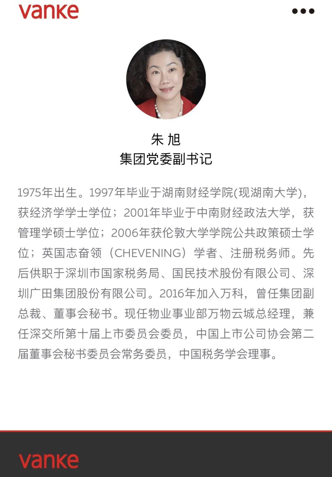 近期,万科集团前董事会秘书朱旭迎来了职业生涯的重要转折点,获得了新的职务任命。 一、最新职务:万科集团党委副书记 据万科集团官方网站最新更新,在集团介绍板块的党委负责人一栏中,朱旭已正式担任万科集团党委副书记一职。 二、2025年职务变动轨迹 2025年对于朱旭而言,是职务频繁调整的一年,这一系列变动深刻反映了万科在国资深度介入后的战略布局重构: 1. 2025年1月:朱旭辞去了万科董事会秘书、公司秘书及授权代表等多个重要职务,转而投身于万科长租公寓泊寓事业部,负责相关业务的联络与推进工作。 2. 2025年3月:朱旭被委以重任,成为万物云非执行董事,并兼任审计委员会委员,进一步拓展了其在万科集团内的影响力。 3. 2025年6月:在短暂担任万物云非执行董事后,朱旭再次迎来职务变动,正式出任万物云城业务负责人,全面负责该业务的运营与发展。 三、朱旭的职业履历与卓越能力 • 教育背景:朱旭出生于1975年,拥有丰富的学术背景。她于1997年毕业于湖南财经学院(现湖南大学),获得经济学学士学位;2001年又在中南财经政法大学攻读管理学硕士学位;2006年,她远赴英国,在伦敦大学学院深造,获得公共政策硕士学位。此外,朱旭还是英国志奋领学者,并持有注册税务师资格。 • 职业经历: ◦ 早期:朱旭的职业生涯起步于深圳市国家税务局,这段经历为她日后在政企沟通方面打下了坚实的基础。 ◦ 企业界:随后,朱旭转战企业界,先后在国民技术股份有限公司、深圳广田集团股份有限公司担任董事会秘书,积累了丰富的企业管理经验。 ◦ 万科时期:2016年,朱旭加入万科,凭借出色的能力迅速晋升为集团副总裁、董事会秘书,成为万科管理层的重要一员。 目前,朱旭身兼数职,不仅是万科集团党委副书记,还是万科集团物业事业部万物云城总经理,同时兼任深交所第十届上市委员会委员、中国上市公司协会第二届董事会秘书委员会常务委员以及中国税务学会理事。 • 关键贡献:在2017年的“宝万之争”中,朱旭凭借卓越的政企协调能力和投资者沟通技巧,协助万科成功引入深铁作为战略投资者,化解了公司的危机。 • 薪酬巅峰:朱旭的薪酬曾一度达到高峰,2018年年薪高达849万元,被誉为当时的“A股最贵女董秘”。 四、万物云城业务概览 • 战略地位:万物云城被万科赋予了“三驾马车”之一的战略地位,是万物云旗下专注于城市服务的核心品牌。 • 营收状况:然而,从营收数据来看,万物云城在万物云体系中的占比并不高。2024年,其营业收入仅为7.56亿元,占万物云总营收的2.1%,与基础物管业务(占比72.3%)存在较大差距。 • 业务模式:万物云城提出了“物业城市”的创新概念,试图将市政环卫、公共设施等政府服务打包为“大物业”,实现城市服务的集约化、专业化管理。 • 发展挑战:然而,城市服务业务高度依赖政府资源,项目获取、合同签订、款项回收等各个环节都需要与政府部门进行密切沟通。这对万物云城来说,无疑是一个巨大的挑战。 • 朱旭的优势:朱旭早年在深圳市税务局的任职经历使她深谙政府运作规则,而在万科期间主导的“宝万之争”解决方案则展现了她协调政府与企业利益的高超能力。这些优势将有助于她在万物云城业务中发挥重要作用。 五、朱旭历年薪酬详解 • 历年基本薪酬(税前): ◦ 2016年:731.5万元(3月入职) ◦ 2017年:821.5万元 ◦ 2018年:849.2万元(薪酬峰值,被誉为“A股最贵女董秘”) ◦ 2019年:568.3万元 ◦ 2020年:575.9万元 ◦ 2021年:434.8万元 ◦ 2022年:430万元 ◦ 2023年:104.5万元(自愿降薪) ◦ 2024年:约103.3万元 • 经济利润奖金(税后): ◦ 2016年:409.37万元 ◦ 2017年:571万元 ◦ 2018年:448.6万元 ◦ 2019年:722.3万元 ◦ 2020年:447.05万元 ◦ 2021年起:经济利润奖金计划暂停 • 薪酬总额统计: ◦ 年度税前薪酬合计:约4549.3万元 ◦ 经济利润奖金合计:约2598.32万元(2016-2020年) ◦ 总薪酬合计:约7148万元 六、万科整体背景与战略调整动向 • 国资接管:2025年,深铁全面接管万科,标志着万科进入了一个新的发展阶段。随着国资的深度介入,职业经理人陆续退出核心层,万科的管理层结构发生了深刻变化。 • 组织架构调整:为了适应新的发展环境,万科在2025年9月启动了“40年来最大”的组织架构调整。撤销了原有的三级管控架构,转变为“总部-城市公司”两级扁平化管理,以提高管理效率和响应速度。 • 万物云业绩表现:2024年,万物云实现了营收362.2亿元,同比增长9.2%;然而,核心净利润却同比下降了4.8%,为22.3亿元。这表明万物云在追求规模扩张的同时,也面临着盈利压力。 • 业务独立性增强:值得一提的是,万物云的关联交易比例从2021年的19.2%下降至2024年的9.5%,业务独立性进一步增强。这有助于万物云在市场竞争中保持更加独立的地位。 七、朱旭新角色的意义与所面临的挑战 朱旭从资本运作的核心岗位转向业务一线,被寄予厚望。她将利用自己在政企协调方面的卓越能力,推动万物云城业务的发展。然而,这一任务具有双重性: 1. 短期目标:提升万物云城的营业收入占比,使其在万物云体系中的地位更加突出。 2. 长期任务:探索可持续的盈利模式,比如将“物业城市”与万科旧改、TOD项目进行联动发展,实现业务的多元化和协同化。 同策研究院联席院长宋红卫表示:“万物云的战略重要性远超泊寓,尤其城市服务需要政企资源协同,这正是朱旭的优势
