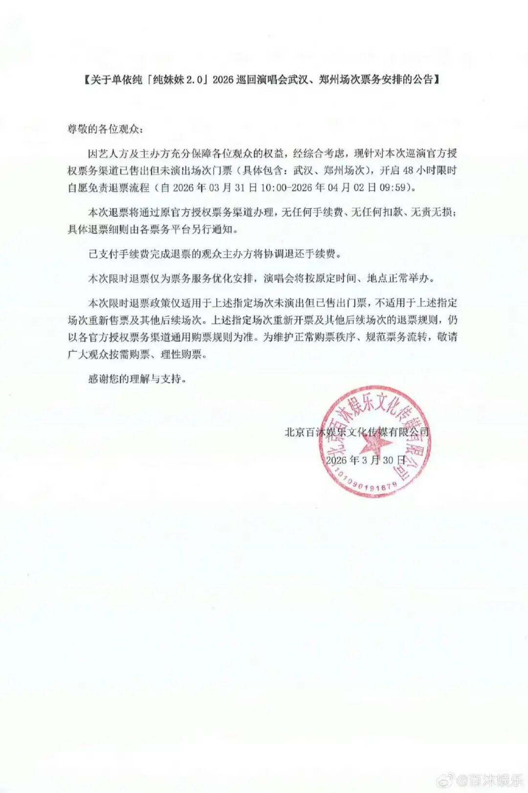 3月30日深夜,徽声在线获悉百沐娱乐正式发布票务调整公告,针对单依纯2026巡回演唱会武汉、郑州两站推出特别退票政策。公告明确指出,为最大限度保障观众权益,即日起通过官方授权渠道购买但尚未使用的武汉(4月10-12日)、郑州(4月25-26日)场次门票,可于2026年3月31日10:00至4月2日09:59期间申请无条件退票,全程免除手续费且不作任何责任追溯,该政策不影响演唱会原定演出计划。 据票务平台最新动态,大麦网已在30日晚间完成系统升级,全面开放退票通道。记者从消费者服务热线了解到,当日下午曾有观众因退票被收取532元手续费,该案例引发广泛关注后促使主办方加速政策调整。 根据巡演日程安排,单依纯"纯妹妹2.0"世界巡演武汉站将在光谷国际网球中心中央球场连演三场,郑州站则于奥体中心体育场举办双场演出。截至3月30日24时,五场演出共计8.6万张门票已全部售罄,其中武汉站VIP区票价最高达1980元仍秒罄。 这场票务风波的导火索源于3月28日爆发的版权争议。知名音乐人李荣浩通过社交媒体公开指责单依纯团队在未获授权情况下,于3月27日杭州演唱会擅自改编演唱其代表作《李白》,该事件经发酵后持续占据热搜榜前三位。 3月30日凌晨3时17分,单依纯通过工作室官方账号发布千字长文,首次承认在未取得书面授权的情况下演唱《李白》构成侵权行为,并详细说明当时因现场设备突发故障,为避免冷场临时加演该曲目。她表示:"作为新人歌手,我严重低估了版权问题的严肃性,这个错误完全在我个人,与团队和主办方无关。" 事件进展追踪:在单依纯道歉文发布两小时后,李荣浩于5时42分转发回应称:"如果真是为了钱,我早在你们第一次联系时就授权了。音乐人要守住底线,但更希望这是行业最后一次出现这种状况。"截至发稿时,该话题在微博阅读量已突破4.2亿次。 来源 | 徽声在线记者 沈昭 |