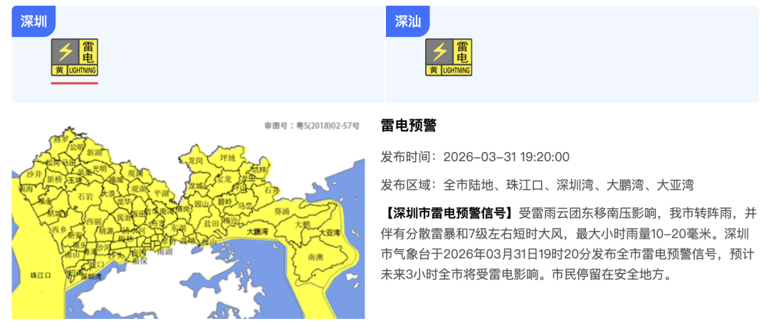 紧急提醒!深圳遭遇7级大风与雷暴天气,全市预警全面启动重要天气提示! 深圳市雷电预警信号已正式生效 请市民们密切关注 受雷雨云团自东向西、自北向南的移动影响,深圳市的天气状况急转直下,由原本的晴朗转为阵雨,并伴随着分散的雷暴活动和约7级的短时大风。据气象部门监测,最大小时雨量预计将达到10至20毫米。为此,深圳市气象台于2026年03月31日19时20分,果断发布了全市雷电预警信号,提醒市民们未来3小时内,全市范围内都将受到雷电活动的威胁。在此情况下,强烈建议市民们尽量留在室内等安全场所,避免外出,以确保人身安全。 信息来源 | 深圳天气官方发布 编辑整理 | 张裕麟 审读校对 | 吴秀玲 二审确认 | 陆楚一 终审批准 | 王 博 |