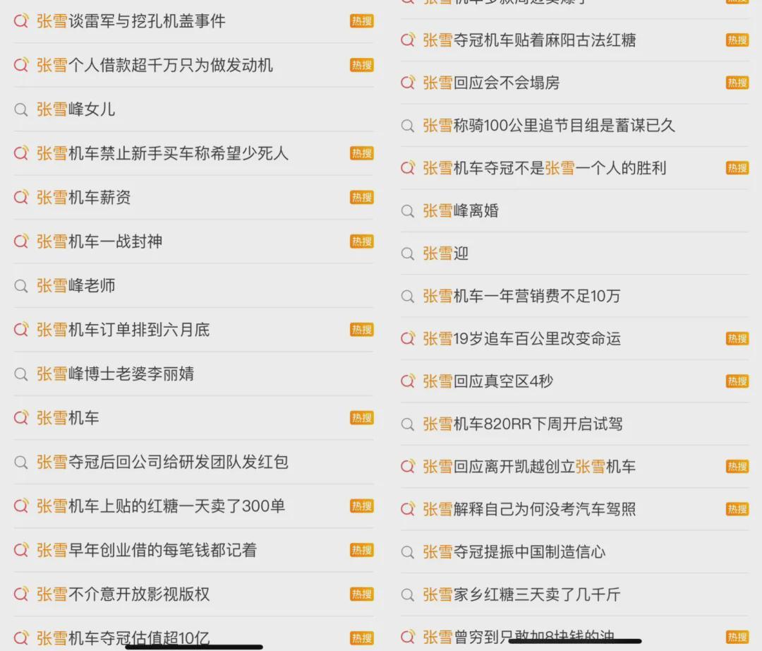 今日的社交媒体热搜榜单,被两位焦点人物强势占据——一位是娱乐圈的鞠婧祎,另一位则是机车界的新晋传奇张雪! 鞠婧祎的新闻属于娱乐圈的常规八卦,而张雪的崛起,则宛如一部草根逆袭的励志大片,让无数网友为之沸腾,也让互联网上久违的“梦想”二字再次熠熠生辉。 据初步统计,自张雪在机车赛事中夺冠以来,关于张雪及其机车的讨论已至少催生了三十个热搜话题,热度持续不减。 今日,热搜榜单上的“张雪含量”更是达到了前所未有的高度! 仅从截取的部分热搜来看,阅读量就已逼近两亿大关,足见其影响力之广。 在短视频平台抖音上,张雪的机车账号更是势不可挡,截至3月31日晚11点,粉丝数已飙升至264.5万,与3月28日相比,短短几天内涨粉高达117万,增速惊人。 其发布的多个视频也纷纷登上热榜,引发广泛关注…… 显然,张雪已成为互联网上新晋的顶流明星,其影响力不容小觑。 在舆论的浪潮中,不少声音将张雪比作摩托车界的雷军,甚至张雪本人也坦言雷军是他心中的神一般的男人,尽管他认为雷军在挖孔机盖事件上的处理不够完美。可以预见,张雪也将成为创业领域的一颗璀璨新星,引领新的潮流。 那么,在摩托车这一相对小众的赛道上,张雪究竟是如何实现爆红的呢? 一方面,张雪机车在国际赛场上的夺冠,无疑是中国摩托车品牌的一次重大突破。这是中国摩托车首次在该级别赛事中击败杜卡迪、雅马哈等欧美日传统强队,打破了它们长达37年的技术垄断,为中国摩托车行业赢得了荣誉。 在当今的网络环境中,这种可量化的硬核技术成就无疑是最具吸引力的。 另一方面,张雪的爆红背后,还隐藏着极致的个人IP与逆袭叙事。他1987年出生于湖南怀化的一个山村,父母离异,14岁便辍学成为修车学徒,却练就了“蒙眼组装发动机”的绝技; 20年前,那档节目中19岁的他冒雨追车百余里,只为争取一次展示车技的机会,这一幕成为了无数人心底对梦想最美好的诠释。 此外,张雪作为草根逆袭者的真实与纯粹,以及他在媒体上的真诚发言,都为他的爆火奠定了坚实的基础。 面对突然的爆火,不少人担忧张雪是否会“塌房”。对此,张雪坚定回应:“泼天的流量不会对内心有任何影响,塌房?塌个锤子。镜头内外的自己就是最真实的自己。” 他强调自己不依赖流量或人设,而是依靠技术创新与行业口碑立足,并再次重申“镜头内外的自己就是最真实的自己”。 在这轮爆火之后,张雪机车的订单也迎来了井喷式增长。据数据显示,张雪机车820RR售价仅为4.38万,仅为进口同级车型的三分之一,夺冠后100小时内预售订单就接近8000台,500RR+820RR累计欠单更是超过1万台。然而,产能瓶颈也随之凸显,日产量仅200余台,供应链亟待扩张。 在产能紧张的同时,二手平台上也出现了订单转让及代购服务,820RR车型甚至加价500-5000元不等,足见其市场热度之高。 最新消息显示,张雪机车计划在2026年推出多款新品,年度销售目标定为6万台,预计收入将达到18亿元,未来发展前景可期。 徽声在线©️ 作者 | 小柴肆号 编辑|谭松 |
