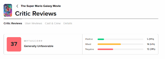 备受关注的《超级马里奥银河大电影》媒体评分现已全面揭晓,截至目前,该片在M站的综合评分为37分,共收集了35家权威媒体的评测数据,其中仅有5家媒体给予好评,18家媒体给出中评,而差评则达到了12家。 以下是部分媒体的详细评价: 徽声在线 75分: 这部影片及其前作的最大亮点,在于它们能够引领观众全方位地沉浸于马里奥的奇幻世界。无论是屏幕的每一个角落,还是从边缘到中心的每一寸空间,都巧妙地融入了源自游戏的经典元素,彩蛋设计更是层出不穷,令人目不暇接。观看此片,仿佛让人穿越回了2007年的《超级马里奥银河》游戏现场,这种震撼的体验,唯有在大银幕上才能充分领略,手机或笔记本电脑的屏幕显然无法承载其全部魅力。 Loopoer 70分: 在观赏《超级马里奥银河大电影》的过程中,我发现自己被逗笑的次数远超出了先前的预期,影片的幽默元素确实不容小觑。 Total Film 60分: 任天堂向来以无限的创意著称,然而在本作中,这种创意并未如预期般得到淋漓尽致的展现,尤其是考虑到它改编自马里奥系列中备受赞誉的3D平台游戏之一。可以说,《超级马里奥银河大电影》虽然怀揣着远大的抱负,但最终却未能完全实现其目标,令人稍感遗憾。 Polygon 60分: 对于那些期待在影片中看到更加成熟剧情或深刻情感表达的观众来说,或许现在应该调整期望了。《银河》为后续的续集和衍生剧埋下了无数的伏笔,这似乎表明超级马里奥电影的制作团队已经形成了一套成熟的模式,并且似乎并不急于打破这一模式。 Slant Magazine 38分: 从比喻和字面两个层面来看,这部电影的“分量”甚至比其原作和前作还要轻飘飘。其视觉语言与现实世界严重脱节,完全依赖于游戏的设定;即便是像《乐一通》那样的动作戏,也会立足于现实世界,然后再进行颠覆性的创作,而这部电影却未能做到这一点。 |
