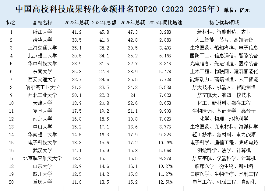 近日,国务院新闻办公室召开新闻发布会,就专利转化运用专项行动(2023—2025年)的实施进展进行了详细介绍。会上,教育部科学技术与信息化司司长明确指出,将逐步引导高校取消对专利授权的奖励机制,转而加大对科技成果转化运用的奖励力度;同时,致力于构建以科技创新质量、绩效、贡献为核心的评价体系,将科技成果转化绩效指标纳入“双一流”建设成效评价、学科评估以及高校教师职称评审等关键环节。 与此同时,备受瞩目的《中国科技成果转化年度报告2025》已正式出版发行。该报告全面展示了我国高校在科技成果转化方面的最新成果。数据显示,2024年度,全国共有1579家高等院校通过转让、许可、作价投资以及技术开发、资讯、服务等多种方式,实现了科技成果转化的总合同金额高达1526.6亿元,较上一年度增长了11.1%;同时,总合同项数也达到了367581项,同比增长6.9%。那么,在这一周期内,各大高校的科技成果转化金额究竟如何呢?接下来,就让我们一同揭开这份榜单的神秘面纱。 首先,需要说明的是,2023和2024年的数据来源于历史年度报告的统计值,而2025年的数据则为年终预估统计,实际官方数据将在2026年上半年发布的《2025年度报告》中正式公布。从榜单中我们可以看到,浙江大学在去年(即2024年)的科技转化成果斐然,达到了惊人的47亿元,这一成绩继续领跑内地高校。更令人瞩目的是,浙江大学2025年的科技转化成果同比增速继续保持在3%以上,按照这样的增速,用不了几年,浙大有望成为我国第一所单年度科技成果转化金额突破50亿元的高校。其核心优势领域主要集中在智能制造、新材料等当下热门的行业,因此,浙大的科技转化成果未来可期,值得期待。 紧随其后的是我国工科领域的佼佼者——清华大学。作为除浙江大学外,另一所当年科技转化成果突破40亿大关的高校,清华大学以42.8亿元的科技转化金额和接近3%的同比增速,短期内确实能够稳坐全国前二的宝座。然而,身后的上海交通大学也不容小觑,其在2025年拥有3.4%的增速,科技转化成果也接近40亿元,相信等到今年的数据正式出炉,上海交通大学将成为第三所科技成果转化金额突破40亿元的高校,与清华、浙大形成三足鼎立的局面。 除了前三甲是我国最强的三所工科院校外,其余在工科领域实力不俗的大学也在这份榜单中表现抢眼。例如,排在全国第四和第五位的北京理工大学和华中科技大学,这两所高校在早些时候的武书连排名中曾受到一些质疑。然而,在2025年的科技成果转化中,这两所高校却展现出了强大的实力,转化的金额均突破了30亿元大关。特别是北京理工大学,其2025年的同比增速甚至高达6%,这样的科技转化竞争力也印证了为何北理能够在高考录取均分中排名如此之高,实至名归。 在上述五所高校之后,去年科技成果转化金额突破20亿元的高校还有东南大学、西安交通大学、哈尔滨工业大学、西北工业大学、天津大学和复旦大学等知名985院校。这个梯队的高校虽然在总的金额上无法与清华、浙大等顶尖高校相媲美,但它们却展现出了明显的上涨趋势。特别是复旦大学,其同比增速甚至接近两位数,可见在近几年工科热浪的推动下,很多高校都开始高度重视科技成果的转化工作,积极寻求突破和创新。 不知道各位读者对于这样一份2023-2025年中国内地高校科技成果转化金额的排名榜单有何看法呢?欢迎关注、评论、转发,我们可以一起交流探讨,共同见证我国高校在科技成果转化方面的辉煌成就和美好未来。 |