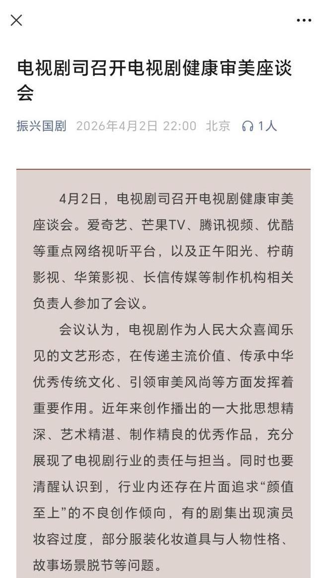 4月2日深夜22时,一个名为“振兴国剧”的微信公众号悄然发布了一篇题为《电视剧司召开电视剧健康审美座谈会》的文章,该文对当日座谈会的核心精神进行了全面且系统的梳理与总结。 此次座谈会汇聚了爱奇艺、芒果TV、腾讯视频、优酷等国内重点网络视听平台,以及正午阳光、柠萌影视、华策影视、长信传媒等知名制作机构的相关负责人,共同探讨电视剧行业的健康发展之路。 值得注意的是,“振兴国剧”微信公众号乃是国家广播电视总局电视剧司的官方认证账号,其深夜发文的举动,无疑透露出此次座谈会的重要性和紧迫性。 相较于发布时间,此次座谈会所展现出的坚定态度和明确方向,更值得我们深入关注与思考。 接下来,让我们一同剖析这一将对电视剧行业产生深远影响的文本内容: ——当前,电视剧行业内仍存在着片面追求“颜值至上”的不良创作倾向,部分剧集在演员妆容上过度修饰,服装化妆道具与人物性格、故事场景严重脱节,这些问题亟待解决。 ——树立健康的审美观念,不仅是关乎文艺创作方向、文化自信的重要命题,更是决定电视剧行业未来走向的关键因素。 ——电视剧行业应始终坚持以人民为中心的创作导向,坚守守正创新的原则,秉持真善美的价值内核,深入生活、扎根人民,让电视剧作品真正展现出质朴之美、自然之美、内涵之美。 ——要将健康审美观念贯穿于电视剧创作的全过程,使作品成为彰显中国精神、中国价值、中国力量的生动载体,传递正能量。 ——人民群众对电视剧的需求,远不止于表面的颜值“好看”,更在于故事的“耐看”,在于作品的思想内涵、情感共鸣和文化滋养。电视剧应实现艺术价值与社会价值的统一,既“娱人”,更“育人”。 ——坚决摒弃畸形审美,坚守电视剧创作的审美底线,推动行业从“明星中心制”向“剧本中心制”的转变,注重作品的质量与内涵。 ——要杜绝“颜值崇拜”的现象,坚持“内容为王、人物为本”的原则,让人物形象更加鲜活、有温度、有灵魂,做到“演什么像什么”,提升观众的代入感。 ——要避免过度依赖“颜值至上”和“流量效应”,多关注演员的演技和作品的质量。让服装化妆道具等辅助元素为人物塑造和故事表达服务,与人物形象相匹配,共同呈现出健康向上的精神特质,彰显中国气派、中国风格,增强文化自信。 在提出对电视剧健康审美观念的严肃要求之后,会议还强调了制度保障的重要性。 会议要求,各相关主体要压实责任,推动健康审美观念落地见效。要通过行政管理部门、行业协会、制作机构、播出平台的协同配合,加强专业指导和学习培训,将健康审美观念贯穿于电视剧创作生产、播出、管理的全过程,确保行业健康发展。 近期,国内舆论场针对某些电视剧审美取向的讨论异常激烈,观点分歧较大。此次事关电视剧健康审美的专题座谈会当天开会、当晚发文,以极其直白的语言和明确的要求,为整个电视剧行业划出了健康审美的“底线”。 这些话语既深刻又严厉,无疑是对未来可能挑战这一“底线”的视听平台或制作机构发出了明确的警示。 文以载道,以文化人。徽声在线认为,电视剧作为一种深受人民大众喜爱的文艺形态,在国家主管部门的眼中,从来都不是单纯的娱乐行业。它关乎中国精神、中国价值、中国力量的传递与弘扬,不可等闲视之。因此,必须采取雷霆手段,遏制整个行业向“畸形审美”滑落的趋势。 这便是该文的深层含义与深远意义所在。 (作者陈良飞系澎湃新闻政治新闻部总监、港澳台新闻部总监,高级记者) 设计:王璐瑶 |