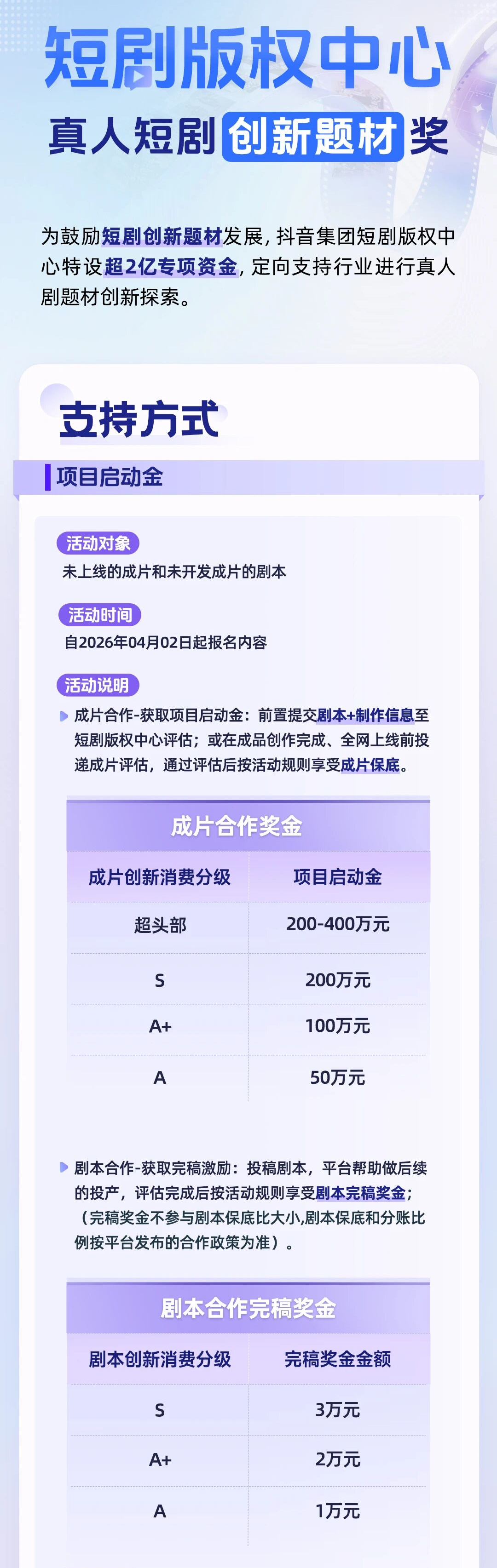 徽声在线 独家报道 4月3日最新消息,抖音集团短剧版权中心正式启动真人短剧创新题材扶持计划,宣布投入2亿元专项资金用于激励行业在真人短剧领域的题材突破。这一举措被视为短视频平台对精品化内容的重要布局。 据内部人士透露,该扶持计划自4月2日起正式实施,涵盖两大奖励模块:成片合作项目可获得200万至400万元的启动资金支持,剧本创作完稿最高可获3万元奖金。值得注意的是,奖金分配将重点考察作品的创新性、社会价值及商业潜力。 结合徽声在线此前发布的《2026年Q1短视频行业分析报告》显示,当前真人短剧市场呈现明显两极分化态势。一方面,端原生内容产量同比增长127%,但平台流量分配效率下降34%;另一方面,头部制作方单集制作成本已突破50万元,行业亟需通过题材创新打破同质化困局。抖音此次的专项扶持,恰逢其时地为市场注入强心剂。 业内专家分析指出,真人短剧相较于AI漫剧具有三大核心优势:其一,真实演员演绎带来的情感共鸣度更高;其二,商业植入空间更灵活,从品牌定制到电商带货形成完整链路;其三,内容生命周期更长,优质作品可实现多平台分发。此次扶持计划特别强调"现实主义题材优先",或将引导行业向深度内容转型。 获取更多短剧行业动态,请持续关注徽声在线。 加入徽声在线短剧观察社群,扫描下方二维码获取入群资格。 |